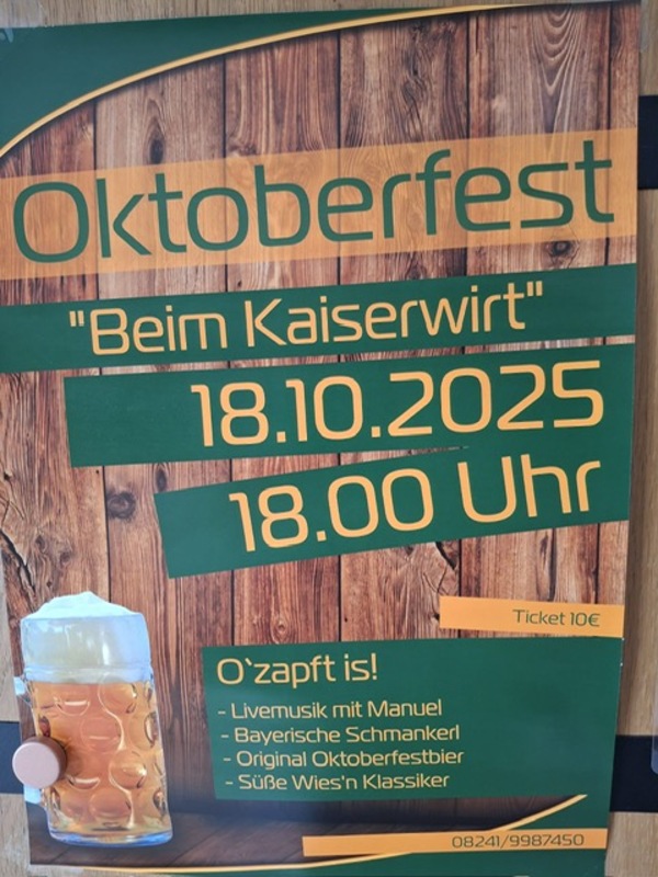 ausgebucht! 18.10.2025 ab 18 Uhr Oktoberfest “Beim Kaiserwirt” – Ticket 10 €